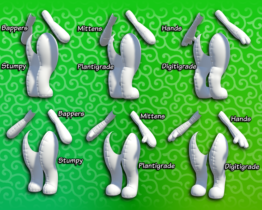 - Contains many customization options: 3 types of hands, 3 types of legs, 6 sets of ears per version, 6 sets of tails per version,